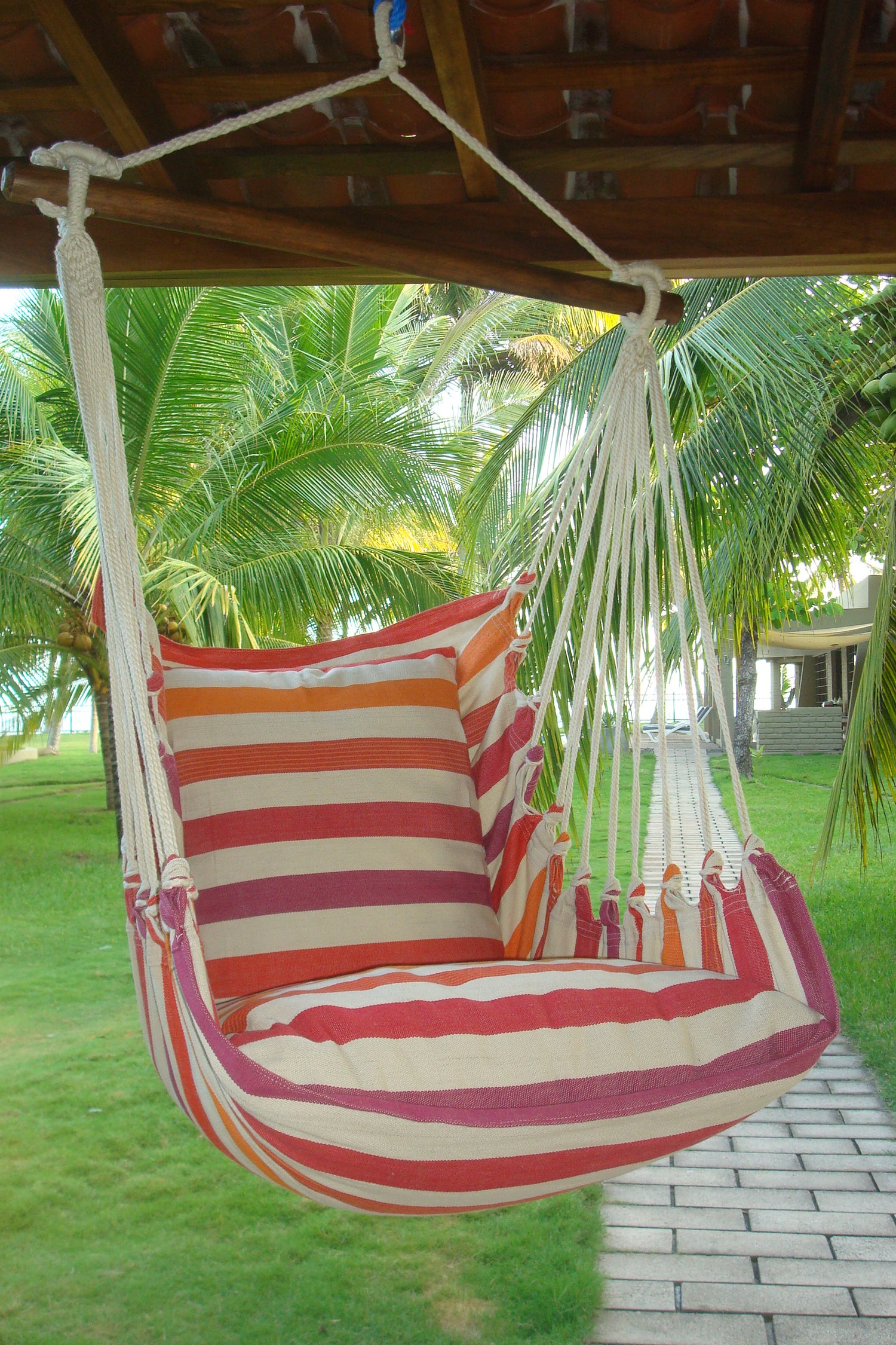 Las sillas colgantes y las hamacas tradicionales colombianas se tejen cuidadosamente la tela con sus coloridos diseños y anudan amorosamente a mano las numerosas cuerdas de suspensión en lazos.